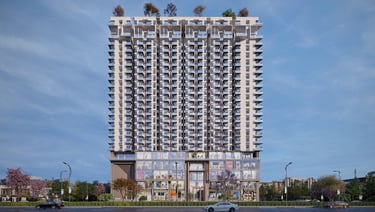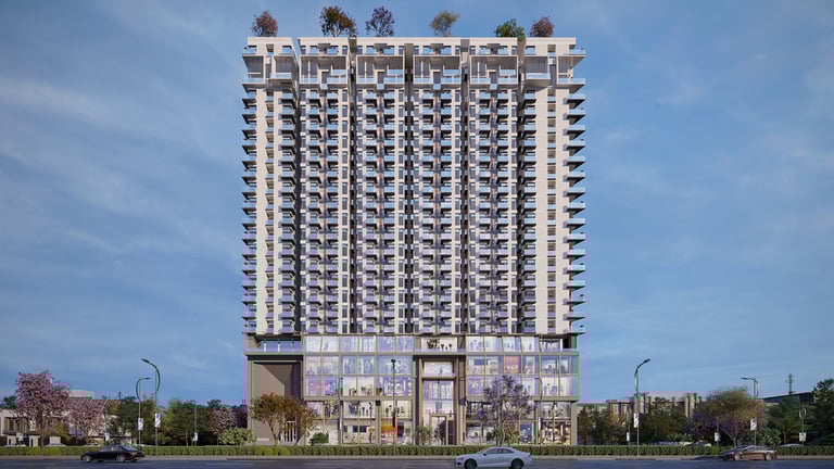 This 30-floor project features a G+6 mall, a 25-story residence with 1-4 bedroom apartments, a penthouse, a helipad, a rooftop garden and basement parking.